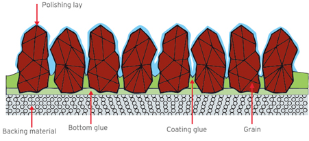 在制造涂附磨具时,需要不同的树脂结合剂将磨粒与背衬材料结合。 先在背材上喷底胶,再在表面喷磨粒,并采用特殊工艺调整。 然后磨粒和粘合剂结合得很好。 结合剂很好地支撑磨粒以承受加工过程中的外力和载荷。