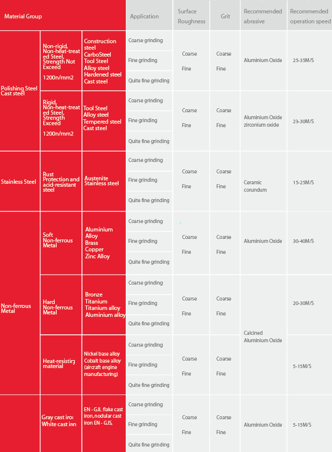 | 降低磨削压力、圆周速度和添加磨削油可降低刀具磨损和工件下降温度 | 为了获得更高的研磨比,建议使用粗砂而不是增加接触压力。 | 应用高研磨速度可以获得光洁的表面。 增加接触压力导致更粗糙的表面。 | ||||||||||||||||||